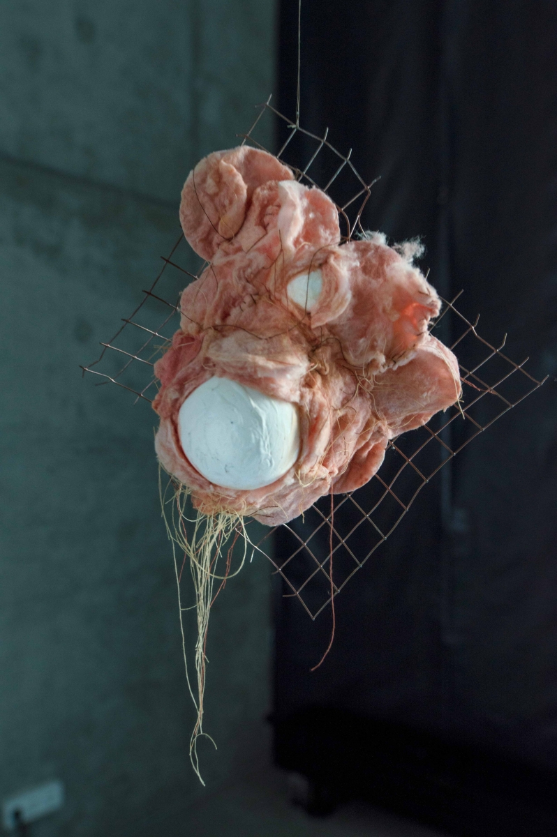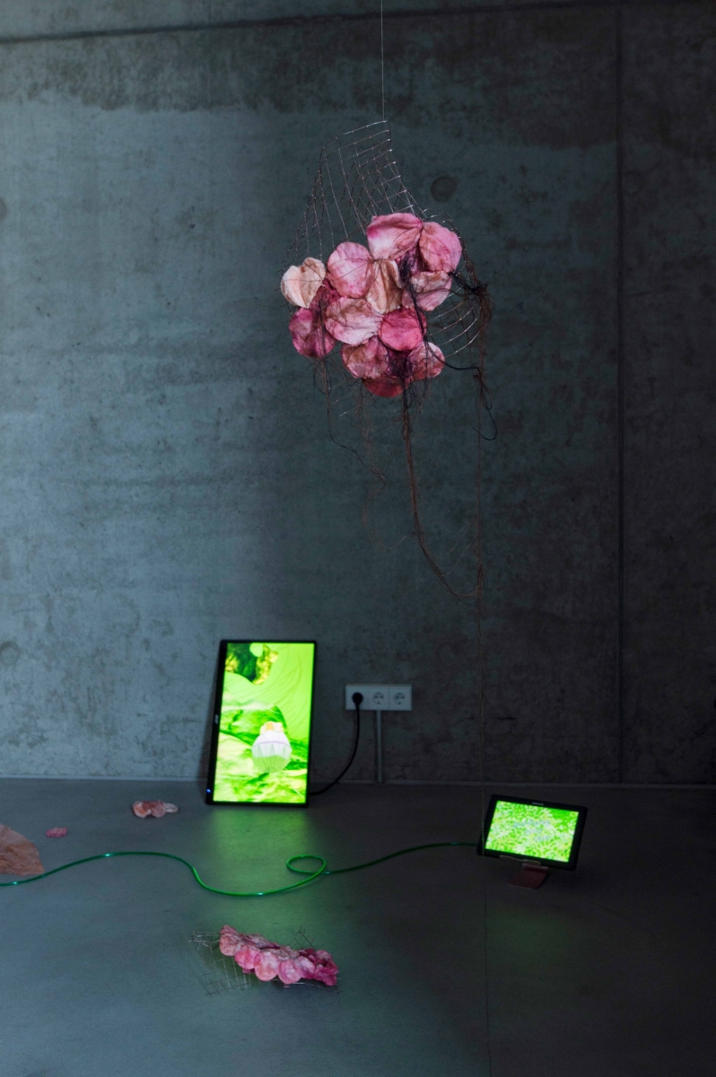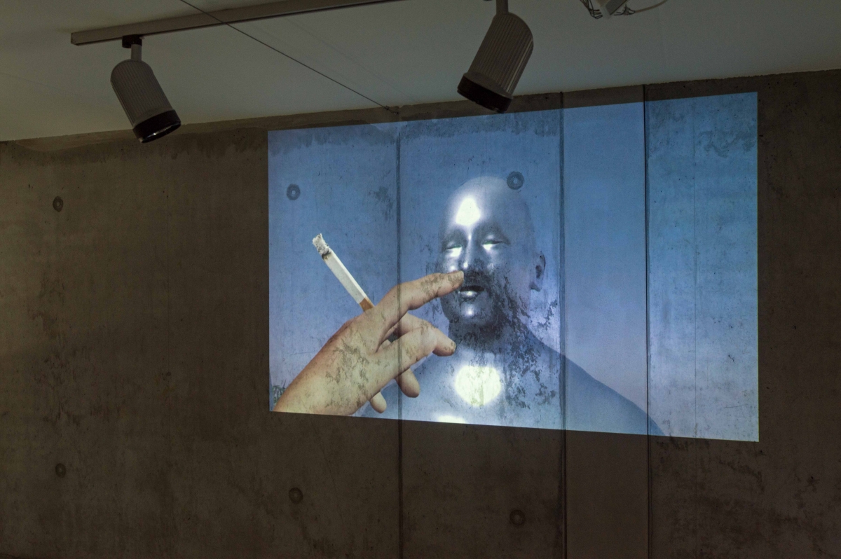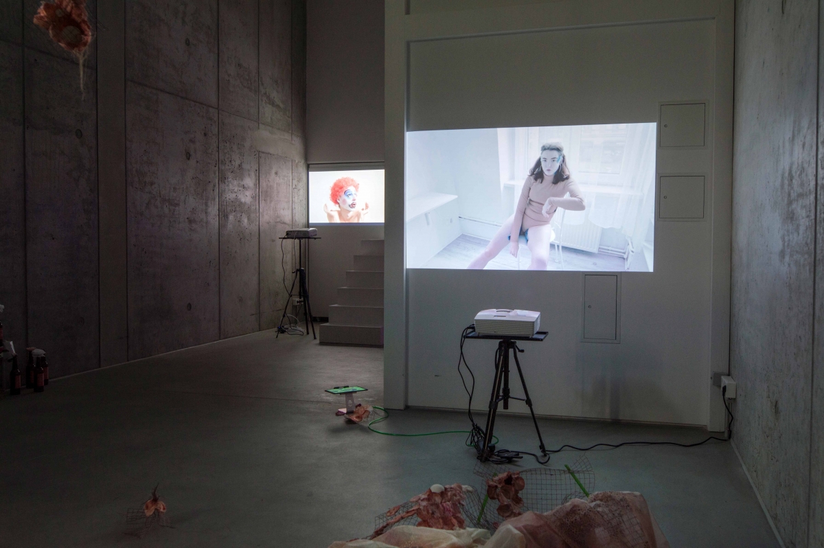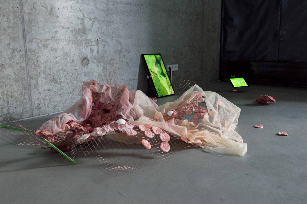 The group exhibition presents three artists who explore ways to present oneself as a contemporary artist in a scene that is success oriented yet fragile in terms of sustainability. The self-ironic undertone of the exhibition comes from a reflection on the cultural world, where artists often don’t have social security, but are expected to work for free. Unavailability of a seriously functioning salary system, being constantly misunderstood within the work field and the never ending blinding race to success creates conditions where one can easily lose touch with their true self and choose to live the life of a persona instead. This will eventually build up to a desire to keep and live up to the appearance of the fiction. The artists have dealt with this, turned it around, and manifested an alternative source of inspiration. The displayed video installations act as self-portraits of each artist by honestly showing a side of themselves that would normally be expected to be kept hidden. By doing this, they reclaim their individuality. The digitality of the exhibited artworks, whether fully implemented in the medium or just slightly hinted at, promotes a hope for a change within the system that inflicts burnout. Having abandoned more traditional methods of creation, the artists' self-portraits are accompanied by sculptural artworks, often being created with ready-made objects that enter ordinary life by being amplified in the context of the exhibition. By taking a microscopic look onto the skin one lives in, with all of its imperfections, they communicate about accepting the uncanny and the awkward. Everyday idiosyncratic social interactions and other true life happenings have influenced a visual language that makes jokes about oneself while being kind of serious simultaneously. Finding joy and pleasure in creation is the answer to overcoming the hardships of this chosen career path and to keep on going.