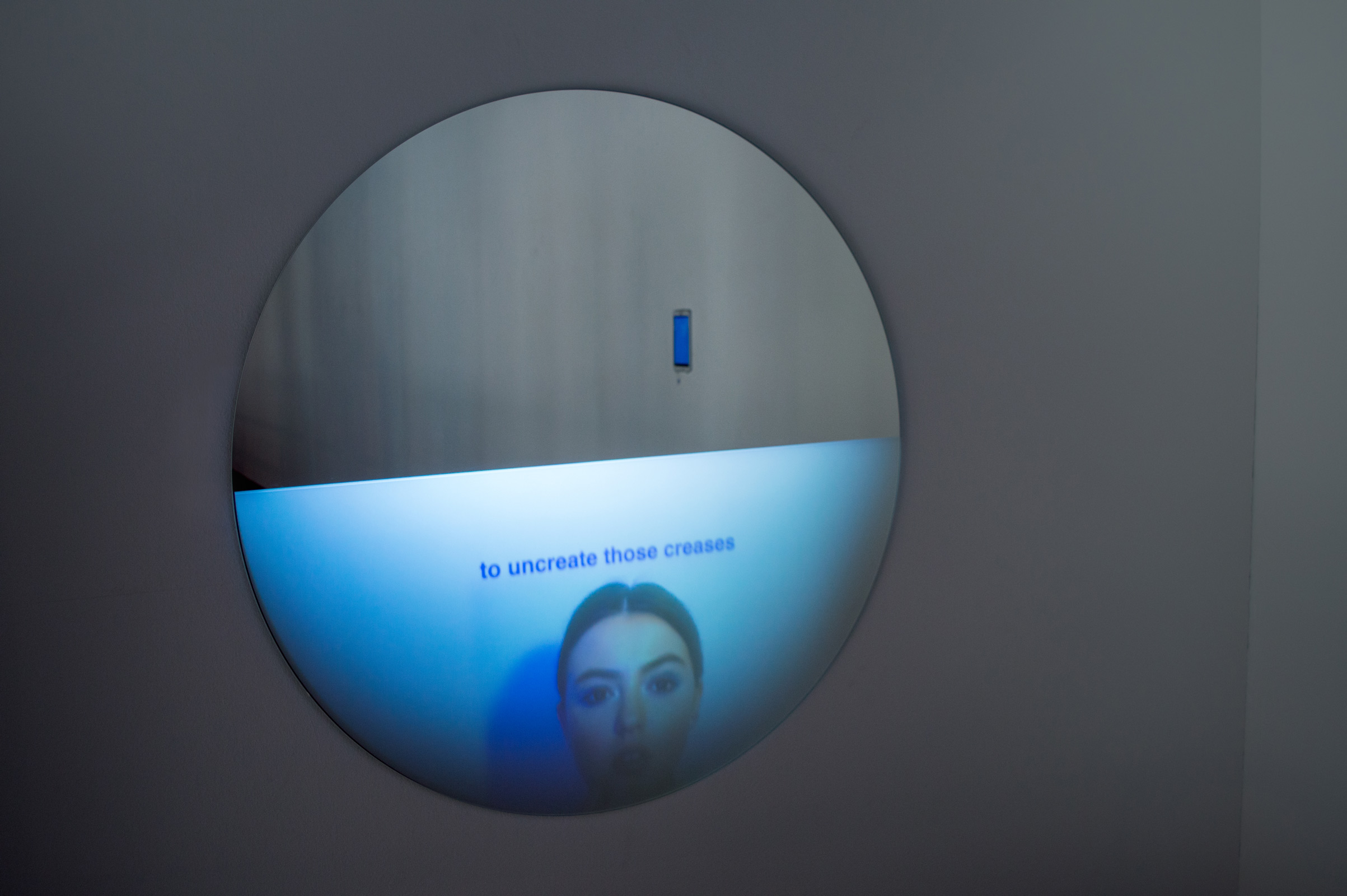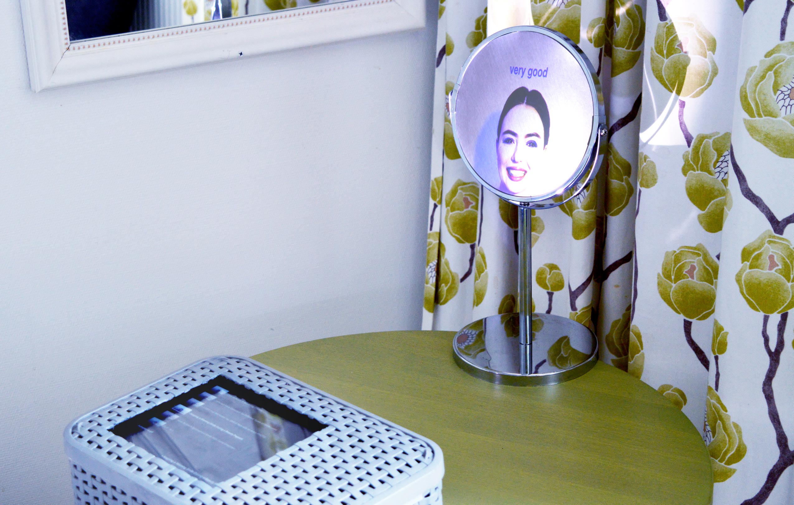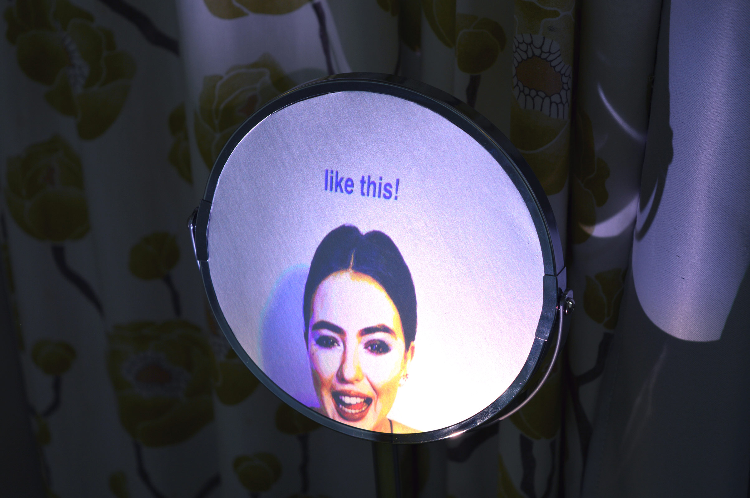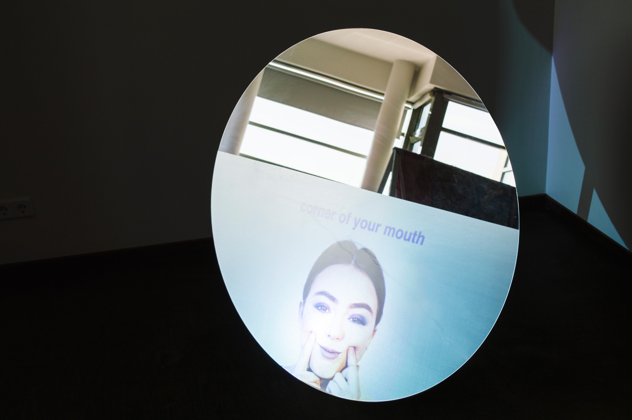 The project consists of exercises, tutorials that the artist presents in front of the camera. Tutorials have become a common way of passing on one another’s teachings in social media. There are all sorts of tutorials - starting from how to simply open a glass jar until it is taught how to smile sincerely. The artist puts herself in the position to test them through her body and facial expressions in front of the camera while watching the instructions. Videos are projected on a mirror. The illusion of a mirror is an important part of the concept as tutorials are usually acted out in front of a mirror and thus the results are reflected directly from the mirror. The interactive part of work gives the viewer a possibility to find their perfect way to smile.